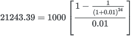PMT( ) 1000 を返す: PMT(0.01, 24, 21243.39)