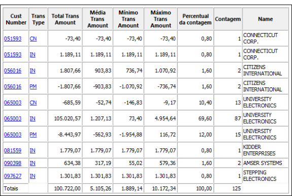 O exemplo abaixo mostra os resultados da sumarização de uma tabela de contas a receber por número do cliente e tipo de transação. O valor da transação é subtotalizado com algumas estatísticas associadas. Os resultados são exibidos na tela.