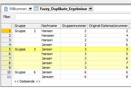 Ausgabeergebnisse für Fuzzy-Duplikate