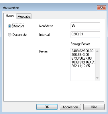 Um die Auswertungsfunktion mit den Ergebnissen einer Währungseinheitsstichprobe zu verwenden, ist es notwendig, dass Sie die Stichprobe mit den Auswahlmethoden „Festes Intervall“ oder „Zelle“ ziehen.