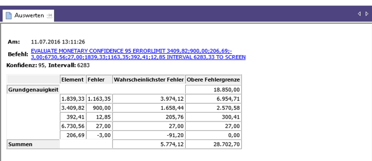 | Summen | Der wahrscheinlichste Fehler und die obere Fehlergrenze für die gesamte Grundgesamtheit oder den Kontensaldo. |