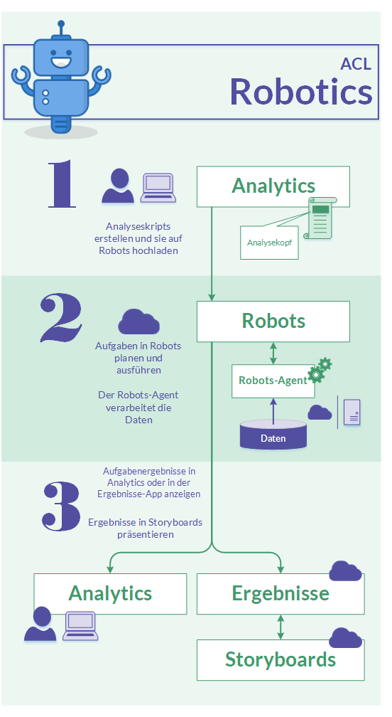 | Mit Robots automatisieren | Robots ist eine HighBond-App, mit der Sie wiederkehrende Aufgaben mit Hilfe von in Analytics definierten Analyseskripts automatisieren können. Robots erledigt sich wiederholende Aufgaben entsprechend Ihrer Konfiguration. |