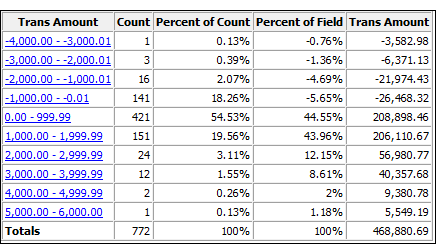 For example, you could stratify an accounts receivable table on the invoice amount field to group records into $5000 intervals – invoices from $0 to $4,999.99, from $5,000 to $9,999.99, and so on – and to find the total number of transactions, and the total transaction amount, for each interval.