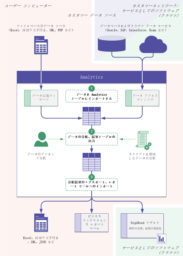 Analytics は、データ アクセス、データ分析、および統合レポートの強力な組み合わせを提供し、データの完全性を保証するデータ分析アプリケーションです。Analytics インターフェイスを使ってアドホックの分析を実行したり、統合 ACL スクリプティング言語でローカルで、またはクラウドで実行する分析を自動化したりします。