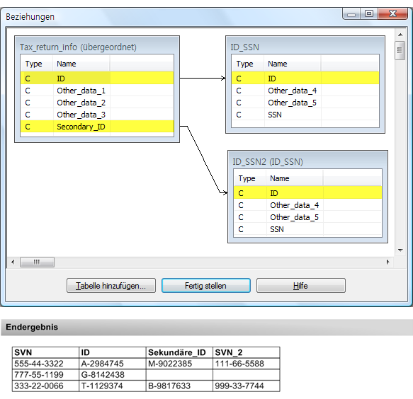 Die primäre oder übergeordnete Tabelle enthält das Feld ID mit den ID-Nummern der Haupt-Steuererklärer und das Feld Sekundäre_ID die ID-Nummern der sekundären Steuererklärer (Gatte/Gattin), falls zutreffend. Die sekundäre oder untergeordnete Tabelle enthält ein ID-Feld mit ID-Nummern für jede Person. Sie können zusammengeführte oder verbundene Daten erzeugen, die Sozialversicherungsnummern sowohl dem Haupt- als auch dem sekundären Steuererklärer zuordnen.