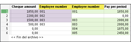 Análisis En la tabla de salida, puede comparar Cheque amount con Pay per period para verificar que se haya pagado al empleado y que el pago haya sido correcto. Puede ver que a los empleados 004 y 005 no se les pagó.