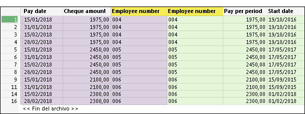 En el siguiente ejemplo, la tabla Payroll Ledger se une con la tabla Employee Records usando el campo clave común de número de empleado (Employee number). El objetivo es hacer pruebas para detectar irregularidades en la nómina. El ejemplo es una unión muchos a muchos.