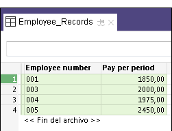 El departamento de recursos humanos realiza el mantenimiento de la tabla Employee Records. Los registros de empleados constan de una lista completa de empleados válidos y la cantidad que se les paga cada período. Un empleado, 002, no aparece en la tabla.