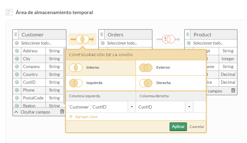 Si agrega más de dos tablas al Área de almacenamiento temporal, la tabla izquierda se encuentra a la izquierda del icono de unión entre las dos tablas que está uniendo y la tabla derecha se ubica a la derecha del icono.