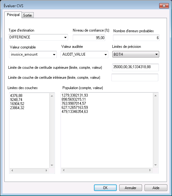 Boîte de dialogue Évaluer CVS : entrées et résultats