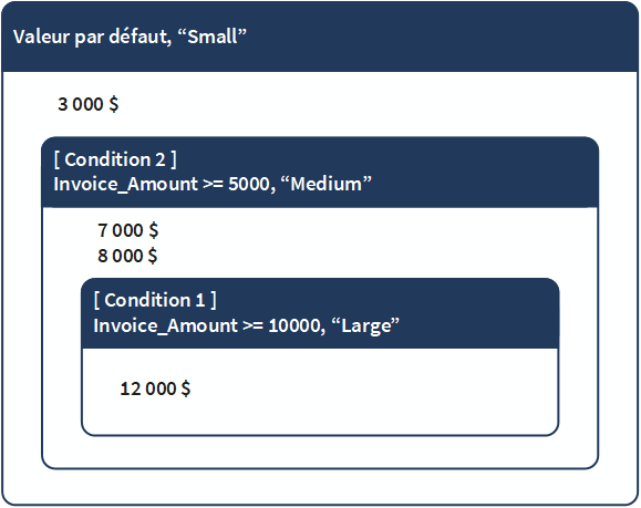Dans l'exemple précédent Invoice size (Taille des factures), des tests sont effectués sur les montants des factures par rapport aux conditions dans cet ordre :