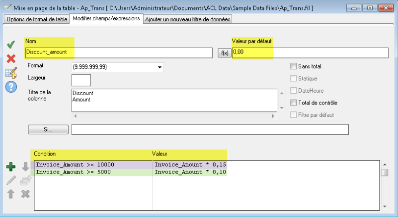L'exemple ci-dessous montre la définition du champ calculé Discount amount (Montant réduction) dans la boîte de dialogue Format de table. La valeur littérale 0,00 s'affiche dans le champ Valeur par défaut. Les valeurs calculées Invoice_Amount * 0,10 et Invoice_Amount * 0,15 apparaissent chacune dans une condition séparée.