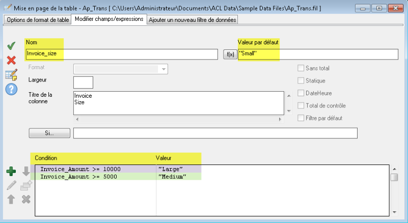 L'exemple ci-dessous montre la définition du champ calculé Invoice size dans la boîte de dialogue Format de table. La valeur littérale « Small » s'affiche dans le champ Valeur par défaut. Les valeurs littérales « Medium » et « Large » apparaissent chacune dans une condition séparée.