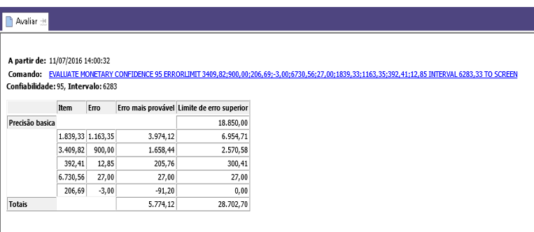 | Totais | O valor de Erro mais provável e o valor de Limite de erro superior para toda a população ou saldo da conta. |