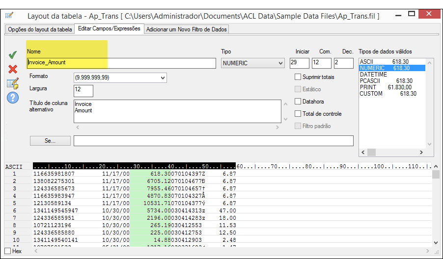 O exemplo abaixo mostra a definição do campo Invoice_Amount na caixa de diálogo Layout da tabela. Na área de visualização de dados, os dados físicos reais incluídos no campo são realçados em verde.