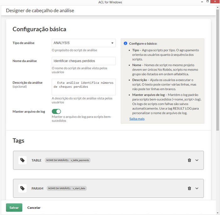 Quando você clica em Salvar no Designer, as tags que configurou são automaticamente convertidas em um cabeçalho de análise na parte superior do script. Você pode editar manualmente o cabeçalho da análise, se desejar, mas a abordagem recomendada é reabrir o Designer para executar edições.