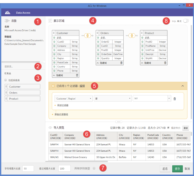 使您可以直接编辑 SQL 导入语句的文本编辑器。 了解 SQL 的用户可以控制数据导入的无法通过用户界面控制的方面。 |