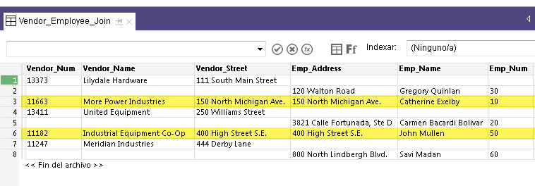La tabla de salida unida contiene los proveedores y empleados con la misma dirección.