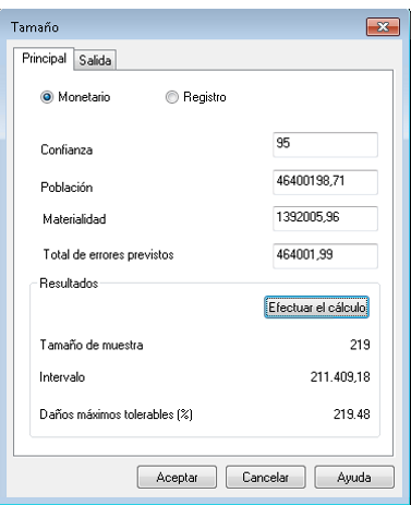 La figura que se incluye a continuación ofrece un ejemplo de los valores de entrada y los resultados de salida al calcular el tamaño de la muestra para el muestreo por unidad monetaria.