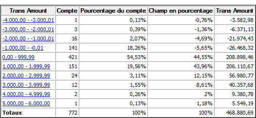Elle sous-totalise éventuellement les valeurs d'un ou de plusieurs champs numériques pour chaque intervalle et calcule le pourcentage de la valeur du champ représenté par chaque sous-total pour le premier champ sélectionné. |