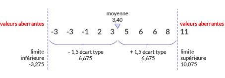 Dans le deuxième exemple, vous utilisez la moyenne ± 1,5 écart type pour déterminer les limites inférieure et supérieure des valeurs aberrantes. À présent, seule une valeur est identifiée comme étant une valeur aberrante.