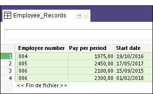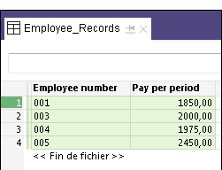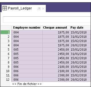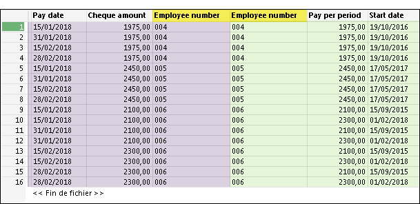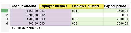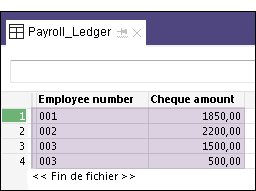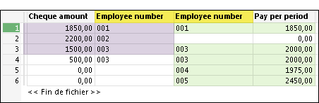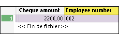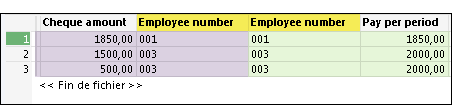 Analyse Dans la table de sortie, vous pouvez comparer le Montant du chèque à Paie par période afin de vous assurer que l'employé a été payé correctement. Vous constatez que l'employé 002 a reçu la somme de 2200 € mais que selon le champ Paie par période, il n'était pas prévu de lui verser une quelconque somme.