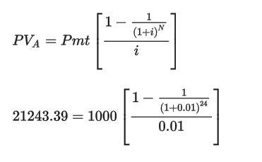 PMT( ) 1000 を返す: PMT(0.01, 24, 21243.39) |