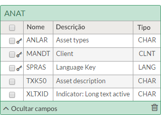 O ícone de campos-chave identifica os campos-chave em tabelas do SAP adicionadas à Área de preparação. O propósito dos ícones de campo-chave é identificar campos que podem ser usados para associar tabelas do SAP.
