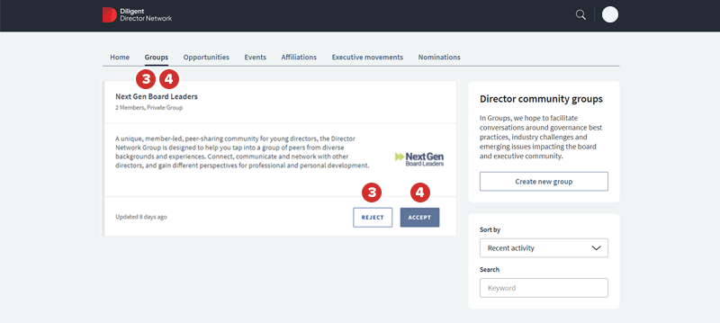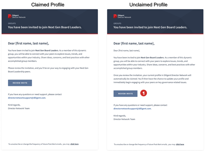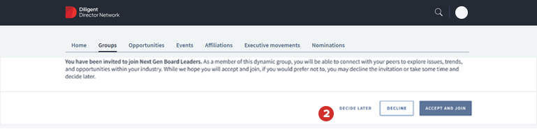 When a group administrator invites a member to join a group, an existing user of Director Network receives one of the following invitations: