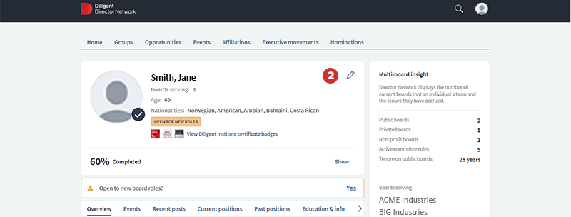 The Diversity and Inclusion section appears only if you select American as your nationality in the General Information section. If your nationality is not American but you would like to disclose your diversity information so that you appear in the diverse candidate lists, email directornetworksupport@diligent.com.