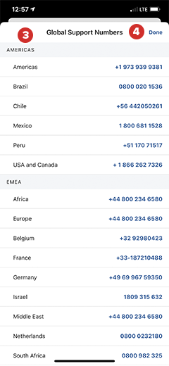 La liste des numéros d’assistance mondiale s’affiche. Sur un iPhone, sélectionnez le numéro de votre région pour l’appeler. Sinon, composez manuellement le numéro de votre région sur un téléphone. Le représentant de l’Assistance mondiale de Diligent vérifiera votre identité en utilisant vos questions de sécurité.
