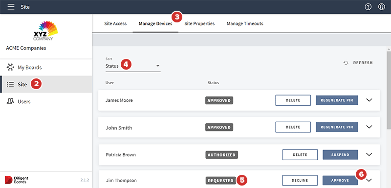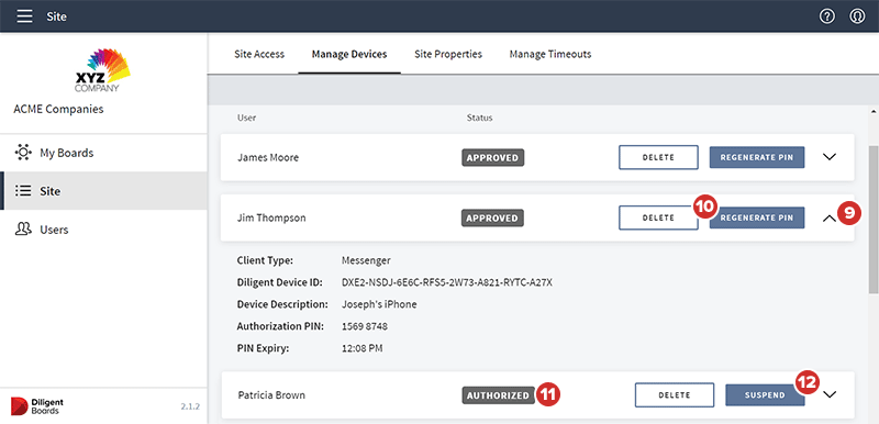 Dopo che l'utente ha inserito e inviato correttamente il PIN sul proprio dispositivo, il suo stato sarà Autorizzato e potrà utilizzare tale dispositivo per accedere a qualsiasi sito Boards.