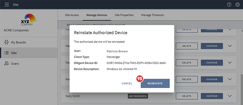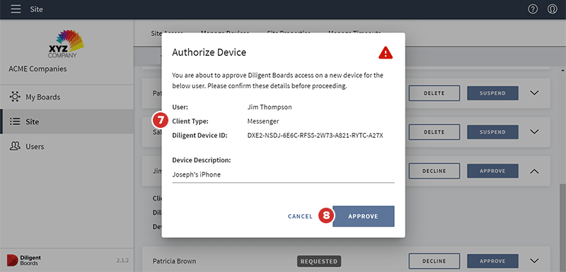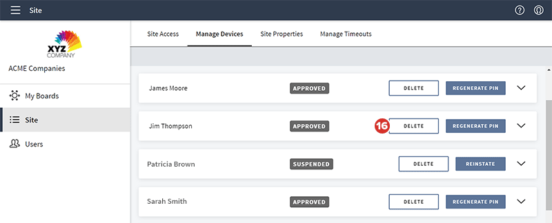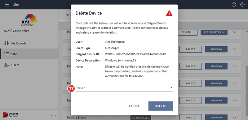 Quando si elimina un dispositivo, l'utente dovrà inviare una nuova richiesta di autorizzazione per il dispositivo per accedere ai propri siti Boards con l'autorizzazione del dispositivo abilitata.