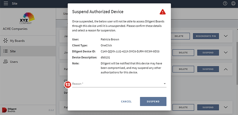Per sospendere un dispositivo autorizzato, selezionare Sospendi. La sospensione di un dispositivo garantisce che l'utente non possa più utilizzare quel dispositivo per accedere a qualsiasi sito Boards, indipendentemente dal fatto che su tali siti la funzione di autorizzazione del dispositivo sia abilitata o meno.
