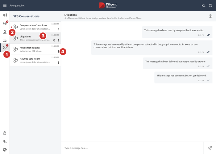 Diligent Messenger は、取締役会の開催前後にドキュメントを安全に管理するためのSecure File Sharing (SFS) ソリューションと統合されています。このページでは、Messenger を使用して、SFS で開始された会話へ安全にアクセスする方法について説明します。