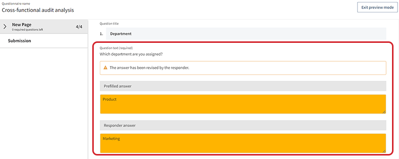 Se o participante revisar uma resposta pré-preenchida, uma mensagem de aviso será exibida abaixo da pergunta. Você pode visualizar a resposta pré-preenchida no campo Resposta pré-preenchida, e a resposta real do participante fica visível no campo Resposta do participante.