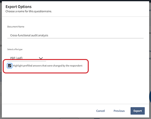 Na tela seguinte, você pode selecionar as opções de exportação, como o nome do documento e o tipo de arquivo. Para incluir marcações de texto no documento exportado, marque a caixa de seleção ao lado de Usar marca-texto nas respostas pré-preenchidas alteradas pelo participante.