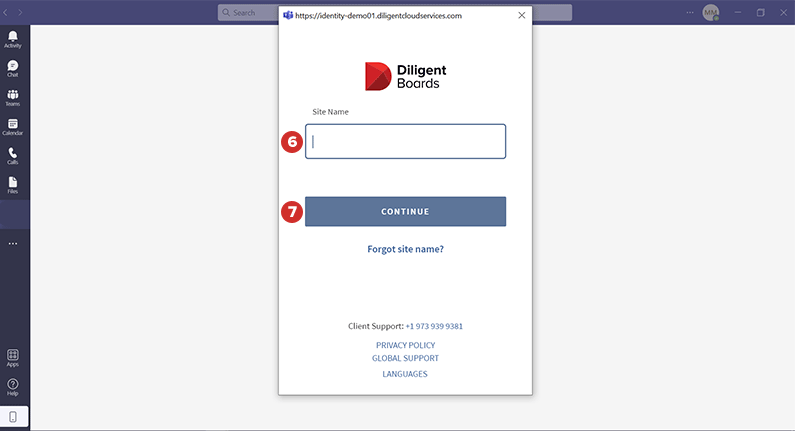 Na primeira vez que entrar, você precisará digitar o nome do site do Boards da sua empresa no campo Nome do site.