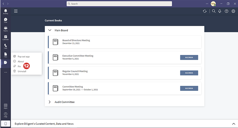 Depois de entrar no Boards Web Director, você pode abrir o aplicativo Diligent Boards no Microsoft Teams para acessar livros do conselho e material de comitê antes, durante e depois das reuniões e usar a funcionalidade de cada hub. Para saber mais, consulte Usando o aplicativo Boards no Microsoft Teams.