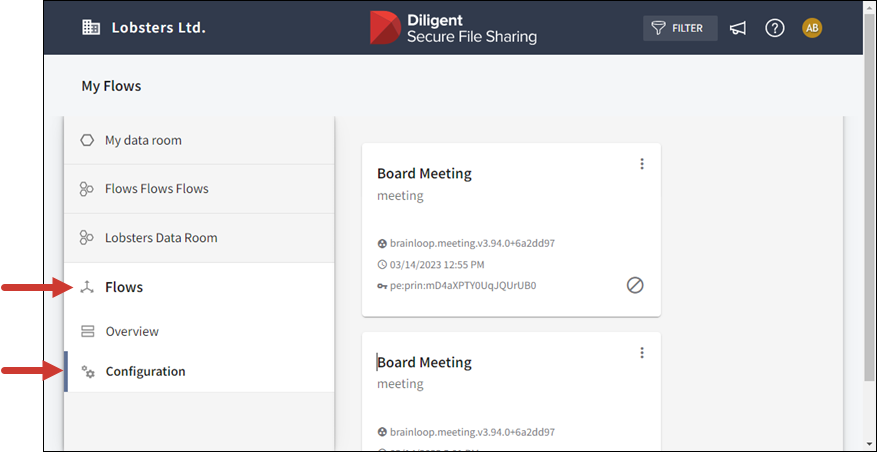 Wenn Sie in der Navigationsleiste für Diligent Data Room „Flows“ auswählen, sollte die Option Konfiguration angezeigt werden.
