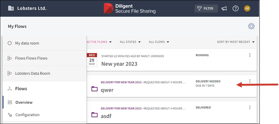 Dans Diligent Data Room, accédez à Flows dans votre barre de navigation et sélectionnez la demande de livraison.