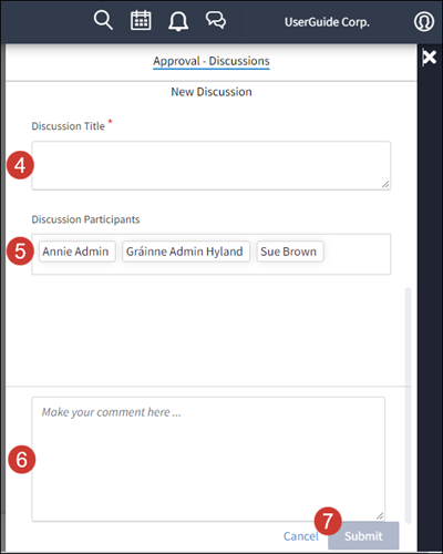 When you are included in a discussion in Diligent Workflow, you will be notified by email. A blue dot will also appear on the discussion icon on your toolbar.
