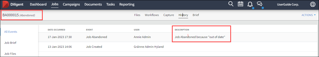The job will now display in the Abandoned Jobs tab and (Abandoned) will be noted beside the job number.