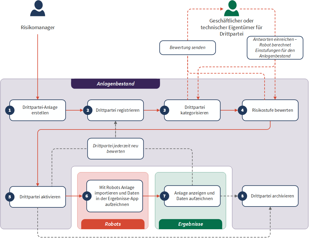 Benutzer | Den Benutzern werden Rollen zugewiesen, um den Lebenszyklus der Drittparteien zu besitzen, zu initiieren, fortzuführen, zu überwachen und abzuschließen. | Risikomanager, Geschäftseigentümer, Drittpartei-Eigentümer |