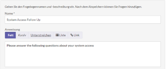 - Klicken Sie im Abschnitt Fragebögen verwalten auf Hinzufügen und geben Sie einen Namen und Anweisungen für den Fragebogen ein.