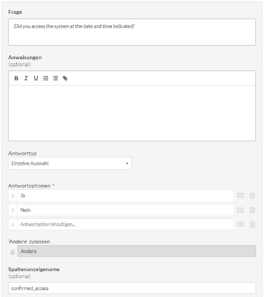 - Klicken Sie auf Hinzufügen und fügen Sie eine Frage vom Typ Einzelne Auswahl hinzu und fragen den Mitarbeiter, ob er oder sie am angegebenen Datum zur angegebenen Uhrzeit auf das System zugegriffen hat.