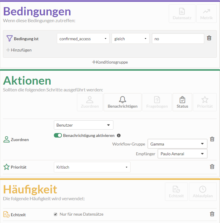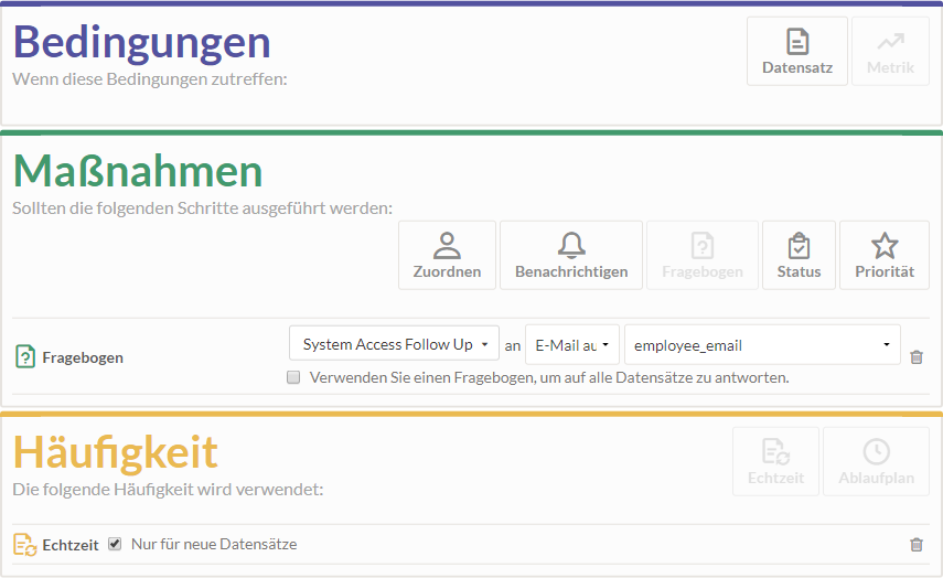 - Konfigurieren Sie einen Echtzeit-Trigger für den Datensatz mit einer Bedingung, die prüft, ob der Fragebogenantwort „Nein” lautet und die folgenden Aktionen anstößt, wenn Datensätze aktualisiert werden: