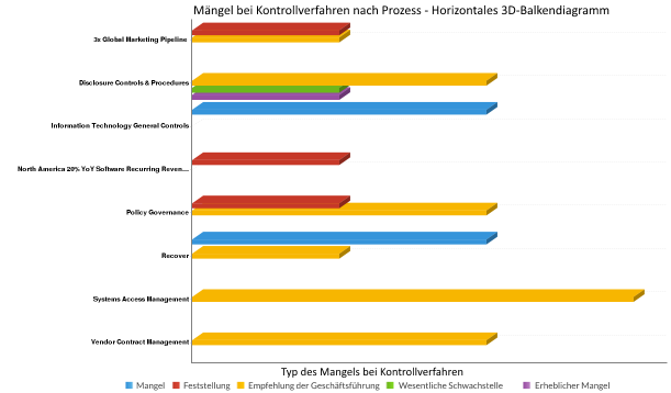 Sie möchten Ihre Feststellungen im Zusammenhang mit Mängeln bei Kontrollmethode nach Prozess in Form einer Visualisierung darstellen. Mit einem horizontalen 3D-Balkendiagramm stellen Sie jeden Prozess dar und demonstrieren klar und deutlich die Informationen der verbundenen Kontrollmängel: