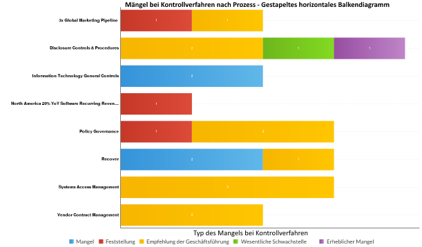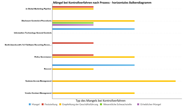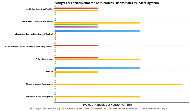 Sie möchten Ihre Feststellungen im Zusammenhang mit Mängeln bei Kontrollmethode nach Prozess in Form einer Visualisierung darstellen. Mit einem horizontalen Balkendiagramm stellen Sie jeden Prozess dar und demonstrieren klar und deutlich die Informationen der verbundenen Kontrollmängel: