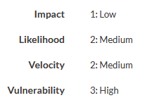 Result You have defined a risk scoring framework that can be used to assess risk on a three-point scale (1-Low, 2-Medium, and 3-High) using the following risk scoring factors: Likelihood, Impact, Velocity, and Vulnerability. Now, you can begin assessing inherent risk using your risk scoring framework.